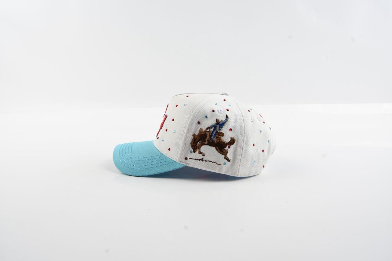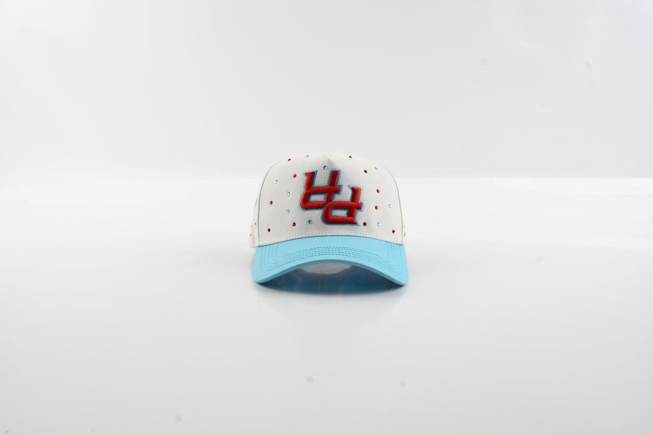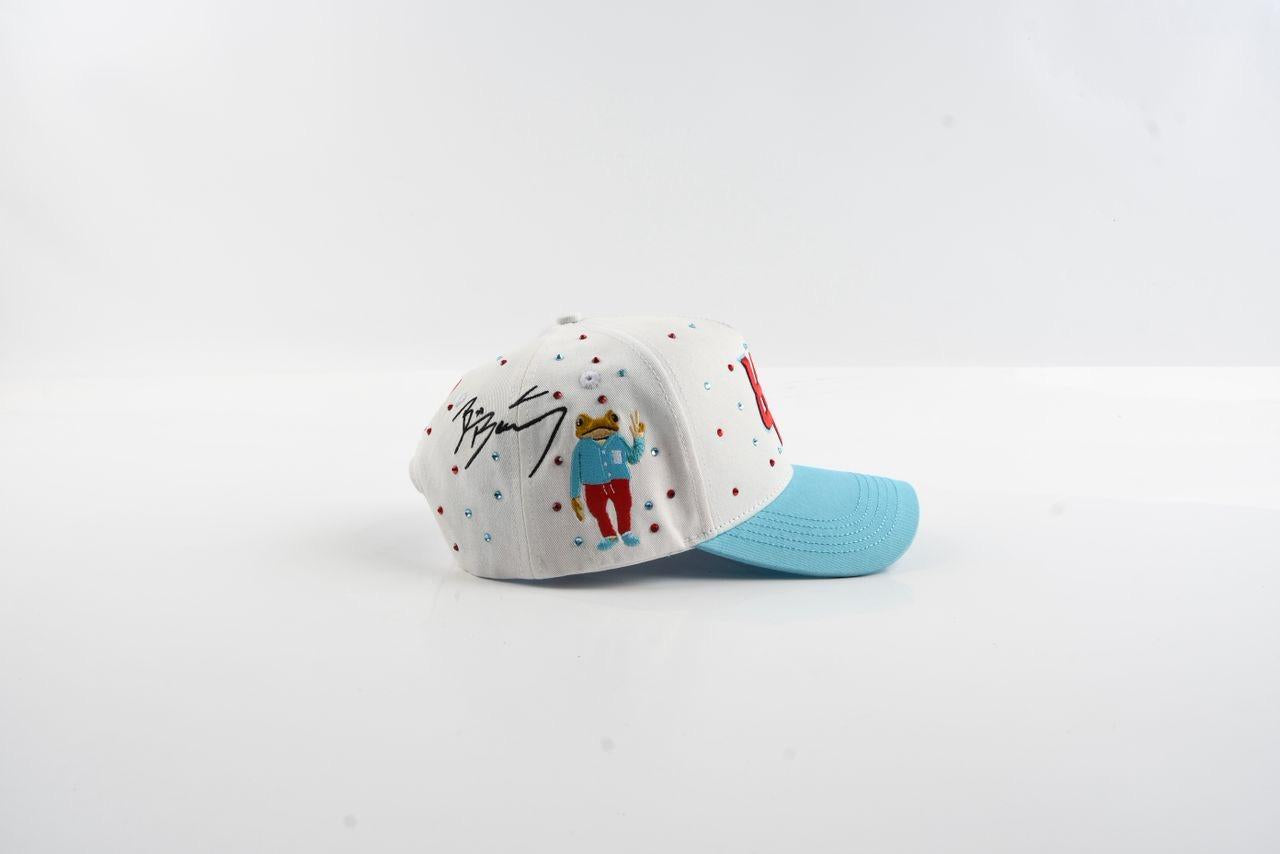 This eye-catching hat features light blue and red rhinestones, four Bad Bunny logos, a large Puerto Rico emblem, and multiple Bad News logos. Inside, it has a satin lining and a hidden stash pocket behind the PR logo. Bold, unique, and made to stand out.